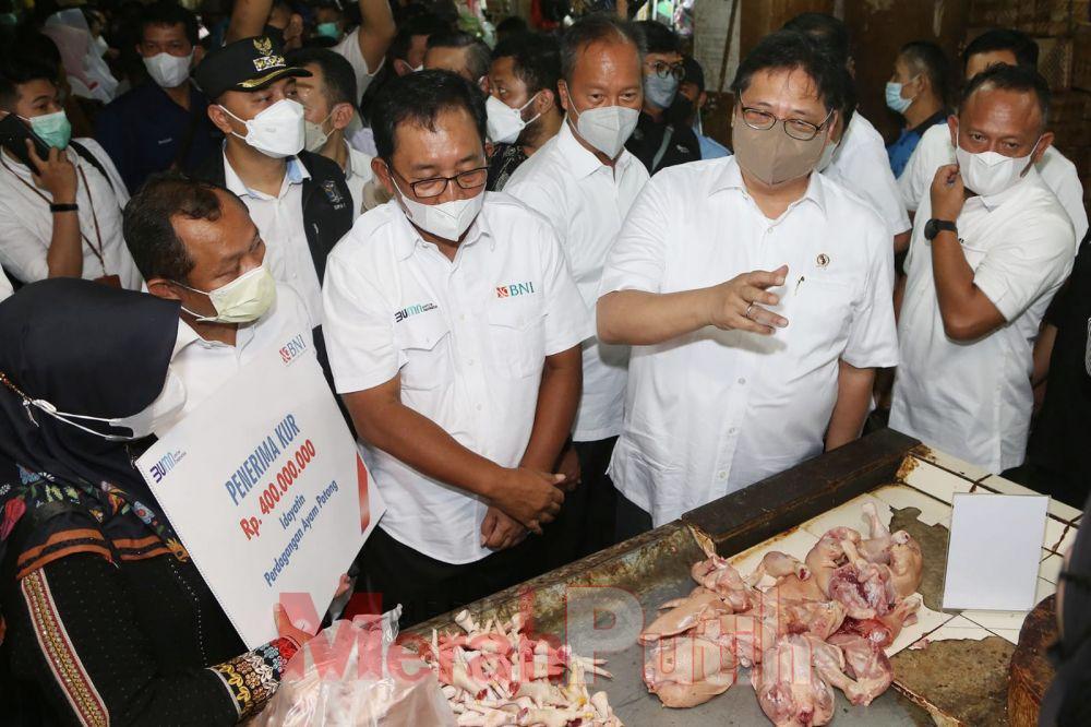 Setelah melakukan pengecekan operasi minyak goreng, Menko Airlangga didampingi Wali Kota Eri dan Wakil Gubernur Jawa Timur Emil Elestianto Dardak, langsung berkeliling menuju ke dalam Pasar Induk Wonokromo Surabaya.