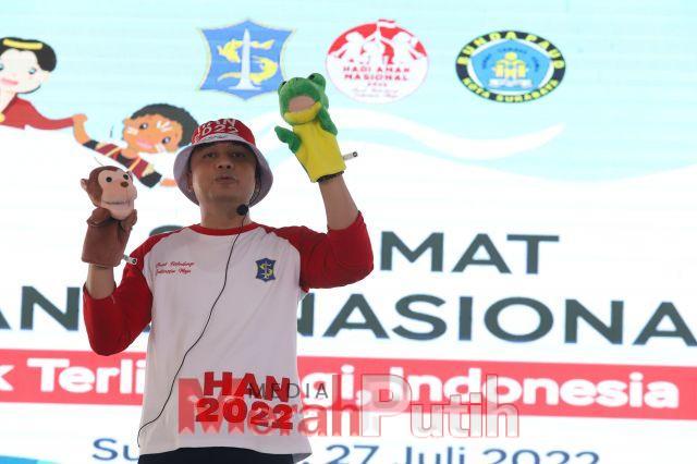 Merah Putih I SURABAYA- Wali Kota Surabaya Eri Cahyadi unjuk kebolehannya dalam Gebyar Hari Anak Nasional (HAN) Tahun 2022 yang digelar di Balai Pemuda Surabaya, Rabu (27/7/2022). Dalam rangkain acara itu, ia mendongeng di depan tamu undangan dan ribuan pelajar Surabaya.
