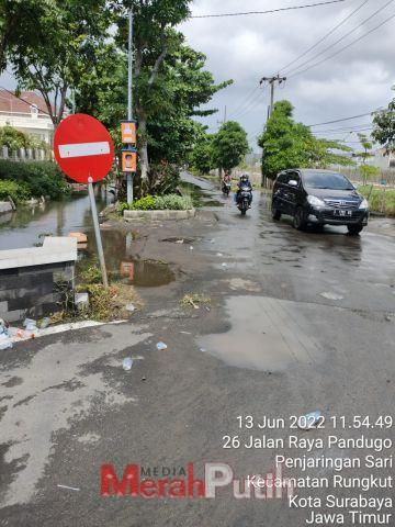 Merah Putih | SURABAYA- Guyuran hujan lebat yang terjadi Senin, (13/6/2022) pagi membuat sejumlah wilayah di Kota Surabaya terjadi genangan. Selain karena tingginya intensitas hujan, adanya air rob dan fenomena La Nina juga menjadi penyebab terjadinya genangan tersebut.