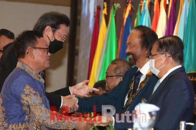 “Saya menyampaikan selamat atas penghargaan doktor honoris causa kepada Pak Surya Paloh,” ujar Jusuf Kalla.