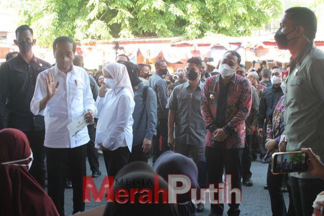 Merah Putih I SURABAYA- Presiden Joko Widodo (Jokowi) menyerahkan langsung bantuan Program Keluarga Harapan (PKH) dan Bantuan Pangan Non Tunai (BPNT), bantuan program Atensi, dan Bantuan Modal Kerja (BMK) kepada warga di Pasar Pucang Anom, Surabaya, Minggu (21/8/2022).