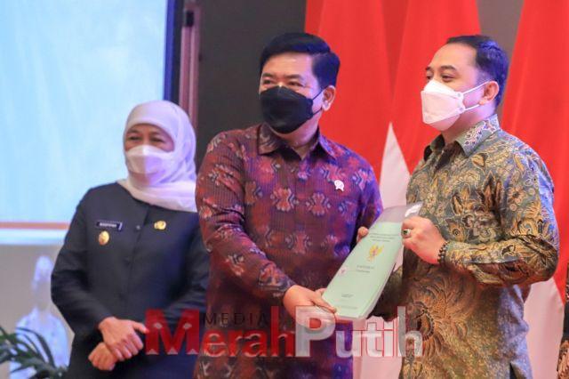 Merah Putih I SURABAYA- Wali Kota Surabaya Eri Cahyadi menyerahkan hibah tanah seluas 5.000 m2 yang berada di Kelurahan Medokan Ayu, kepada Kepala Kantor Badan Pertanahan Nasional (BPN) II Kota Surabaya Lampri, yang disaksikan langsung oleh Menteri Agraria dan Tata Ruang/Kepala Badan Pertanahan Nasional (ATR/BPN) Hadi Tjahjanto, Jumat (1/7/2022).